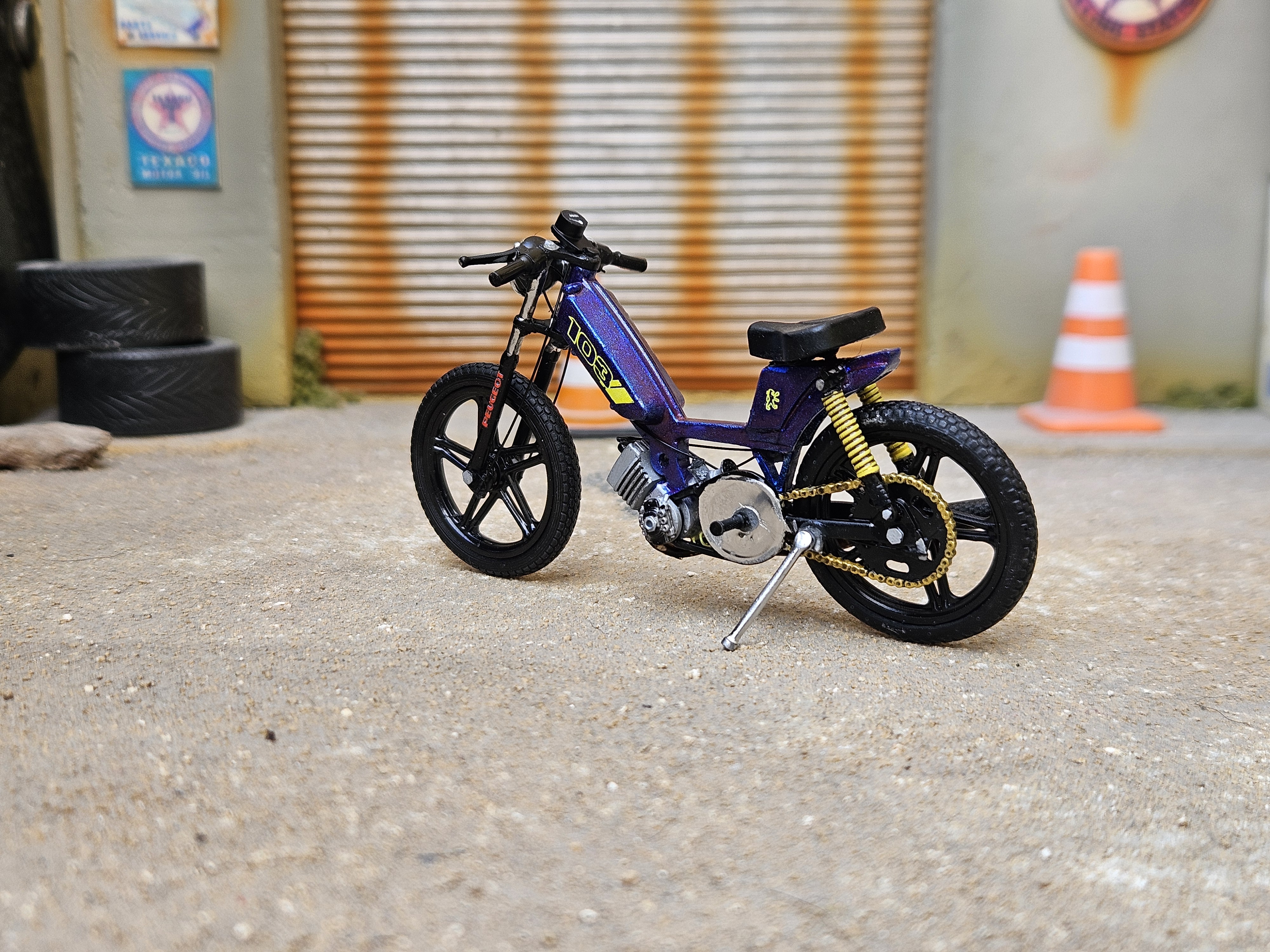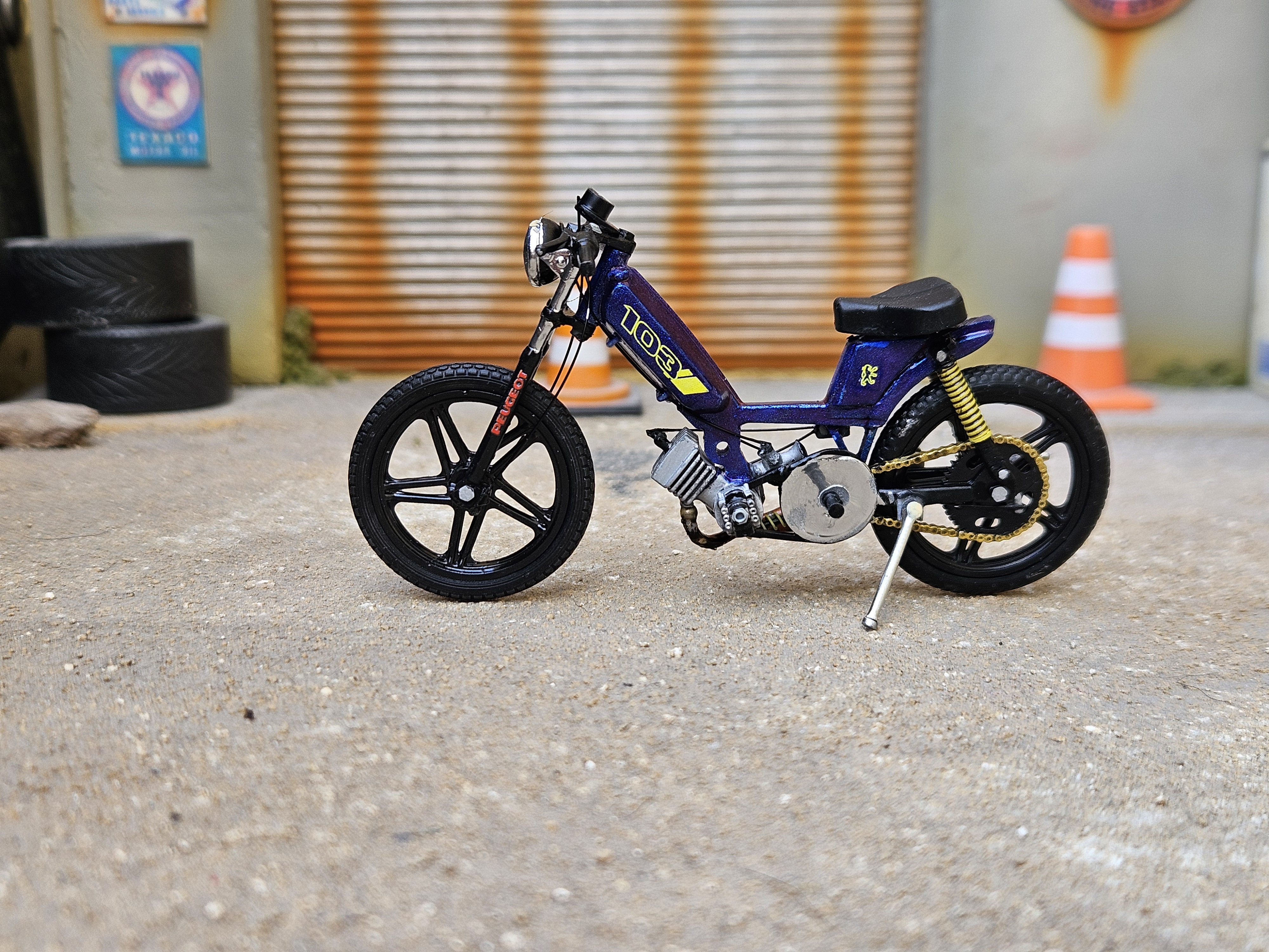 Cette mob Peugeot 103 Sp miniature a reçu quelques modifications :